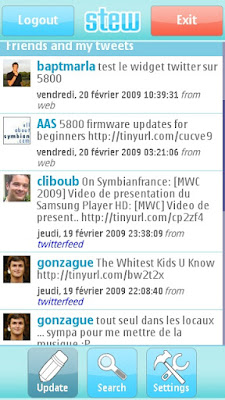 Presenting the Stew. This widget for the Nokia 5800 XpressMusic lets you view your Twitter stream, as well as post updates, right from your phone! Stew was written as an S60 widget, and is able to update over WiFi or a cellular network.